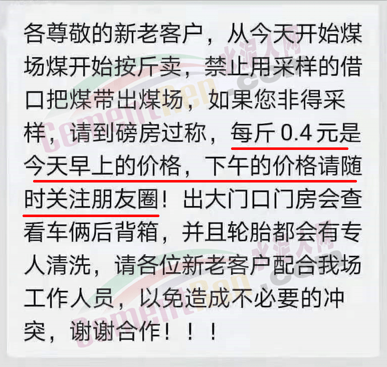 有煤場發消息稱:“各尊敬的新老客戶,從今天開始煤場煤開始按斤賣,禁止用采樣的借口把煤帶出煤場,如果您非得采樣,請到磅房過稱,每斤0.4元是今天早上的價格,下午的價格請隨時關注朋友圈!出大門口門房會查看車倆(輛)后背箱,并且輪胎都會有專人清洗,請各位新老客戶配合我場工作人員,以免造成不必要的沖突,謝謝合作!!”
