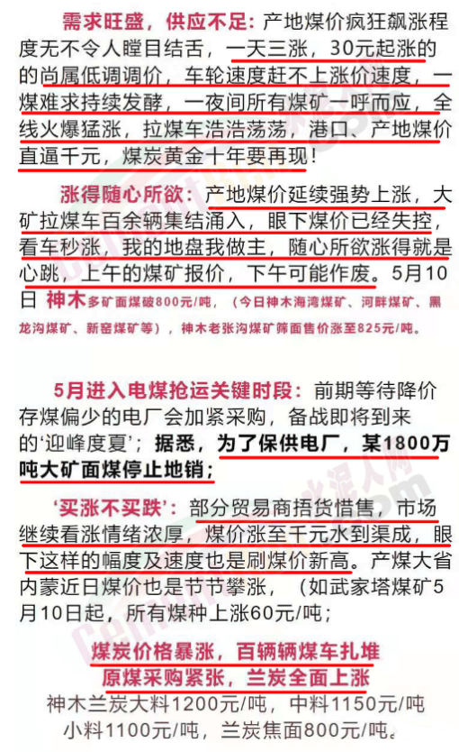 產地煤價瘋狂飆漲程度無不令人瞠目結舌,一天三漲,30元起的尚屬低調調價,車輪速度趕不上漲價速度,一煤難求持續發酵,一夜間所有煤礦一呼而應,全線火爆猛漲,拉煤車浩浩蕩蕩,港口、產地煤直逼千元,煤炭黃金十年要再現!