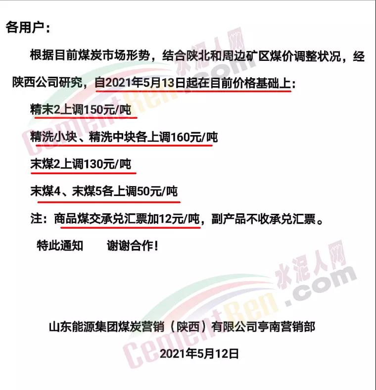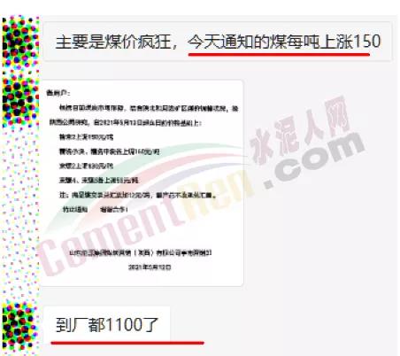 河南某水泥企業采購人員對水泥人網表示,12日收到通知,煤價再漲150元/噸,到廠價都1100元/噸了。