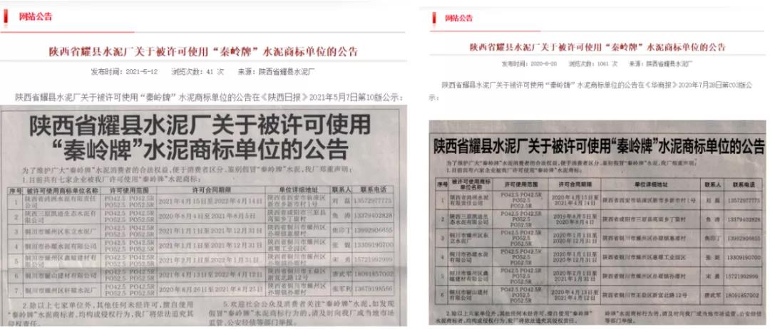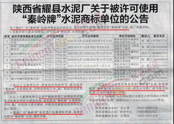 日前,陜西省耀縣水泥廠發(fā)布《關(guān)于被許可使用"秦嶺牌"水泥商標(biāo)單位的公告》稱:為了維護(hù)廣大“秦嶺牌”水泥消費(fèi)者的合法權(quán)益,便于消費(fèi)者區(qū)分、鑒別假冒“秦嶺牌”水泥。工廠鄭重聲明:目前共有七家企業(yè)被陜西省耀縣水泥廠許可使用“秦嶺牌”水泥商標(biāo)。除已授權(quán)的七家單位外,其他任何未經(jīng)許可,擅自使用“秦嶺牌”水泥商標(biāo)者,均構(gòu)成侵權(quán)行為,企業(yè)將依法追究其侵權(quán)責(zé)任。