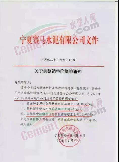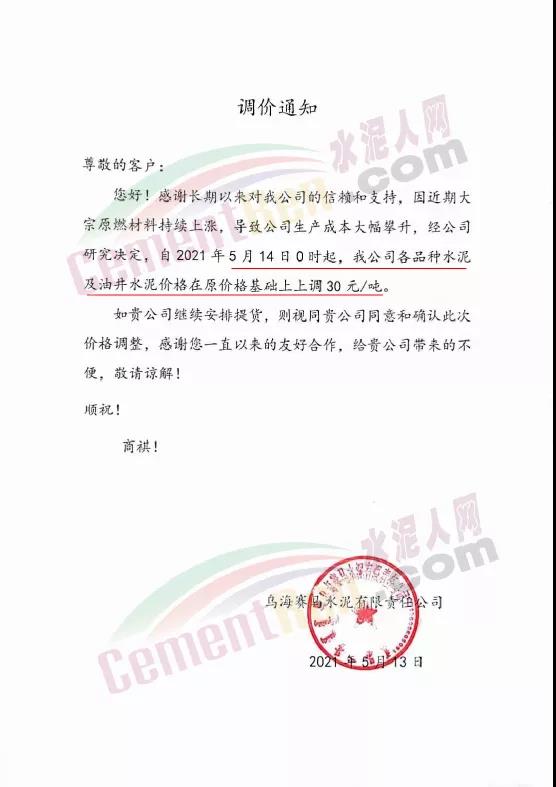 同日,烏海賽馬有限責任公司通知,因近期大宗原燃材料持續上漲,導致公司生產成本大幅攀升,經公司研究決定,自2021年5月14日0時起,各品種水泥及油井水泥價格在原價格基礎上上調30元/噸。