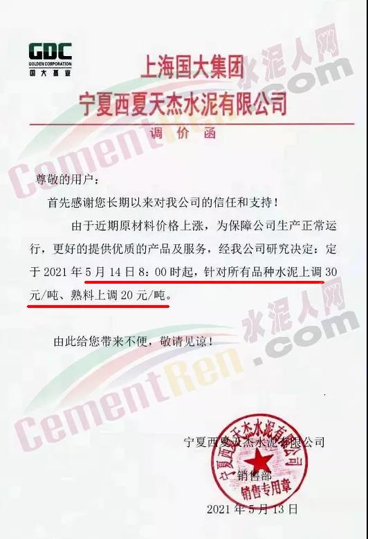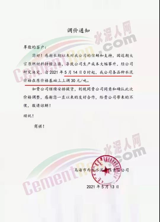 烏海市西水水泥有限責任公司通知,因近期大宗原燃材料持續上漲,導致公司生產成本大幅攀升,經公司研究決定,自2021年5月14日0時起各品種水泥價格在原價格基礎上上調30元/噸。