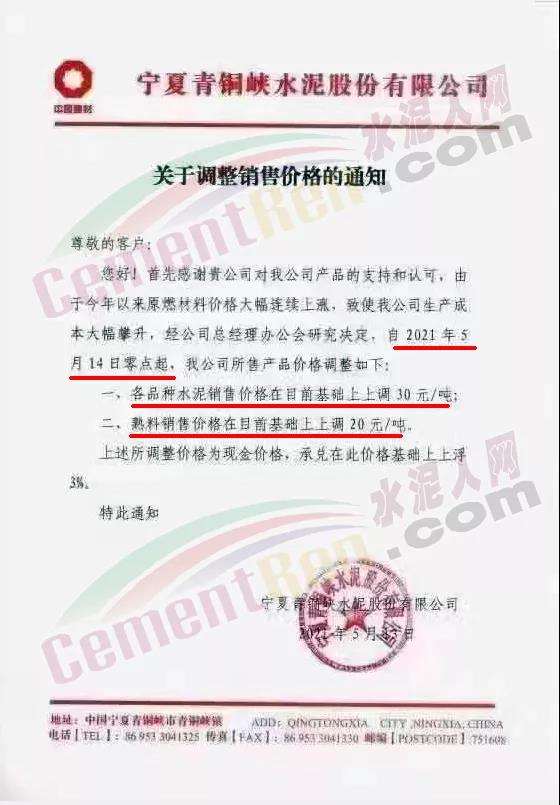 寧夏青銅峽水泥股份有限公司通知由于今年以來原燃材料價格大幅連續上漲,致使公司生產成本大幅攀升,經公司總經理辦公會研究決定,自2021年5月14日零點起,各品種水泥銷售價格在目前基礎上上調30元/噸;熟料銷售價格在目前基礎上上調20元/噸。上述所調整價格為現金價格,承兌在此價格基礎上上浮3%。