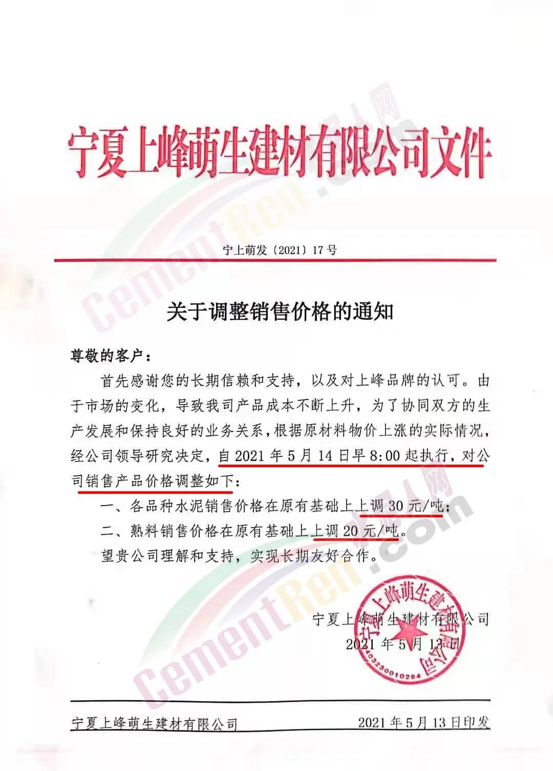 寧夏上峰萌生建材有限公司通知由于市場的變化,導致公司產品成本不斷上升,為了協同雙方的生產發展和保持良好的業務關系,根據原材料物價上漲的實際情況,經公司領導研究決定,自2021年5月14 日早8∶00 起執行,對公司各品種水泥銷售價格在原有基礎上上調 30 元/噸;熟料銷售價格在原有基礎上上調 20 元/噸。
