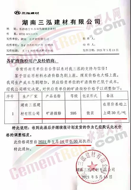 同期,湖南多家礦粉企業通知上調礦粉價格。湖南三泓建材有限公司通知稱因原材料價格不斷上漲,成本急劇增加,經公司研究決定,從2021年5月14日開始,對所有區域礦粉價格在原來基礎上上調30元/噸。