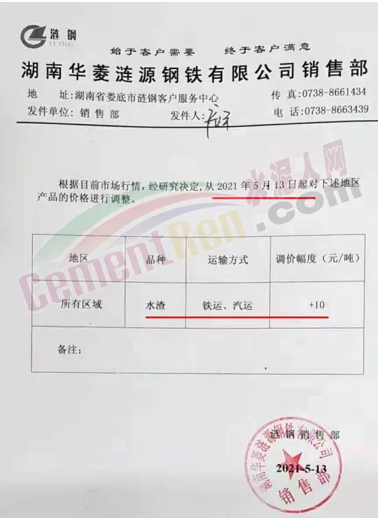 湖南華菱漣源鋼鐵有限公司銷售部通知,根據目前市場行情,經研究決定,從5月13日起對所有區域鐵運、汽運水渣品種上調10元/噸。