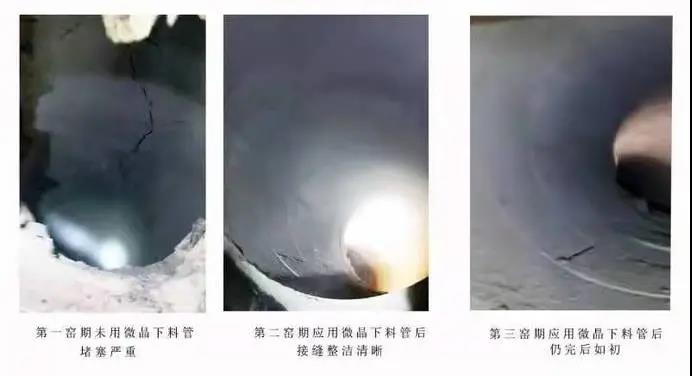 2020年10月份水泥窯檢修時發現整體微晶下料管內沒有任何結皮,下料管的接口條紋清新可見,工程技術人員對此狀況驚嘆不已,當場決定不做任何修正繼續使用。又經過第二窯期的運行至今年四月底,再次停窯后發現下料管仍完好如初,于是順利投入了第三個窯期的運行。