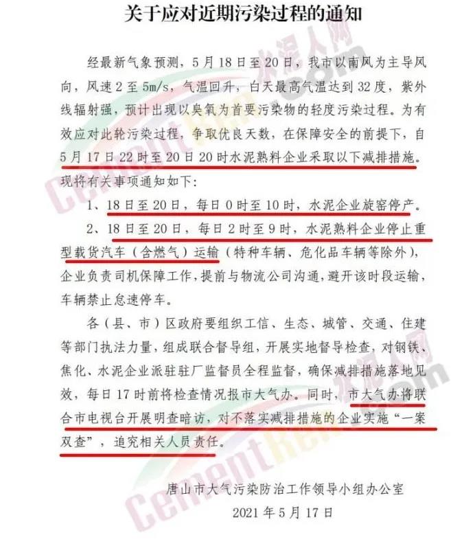 5月17日唐山市大氣污染防治工作領導小組辦公室發布《關于應對近期污染過程的通知》稱,自5月17日22時至20日20時水泥熟料企業采取以下減排措施。