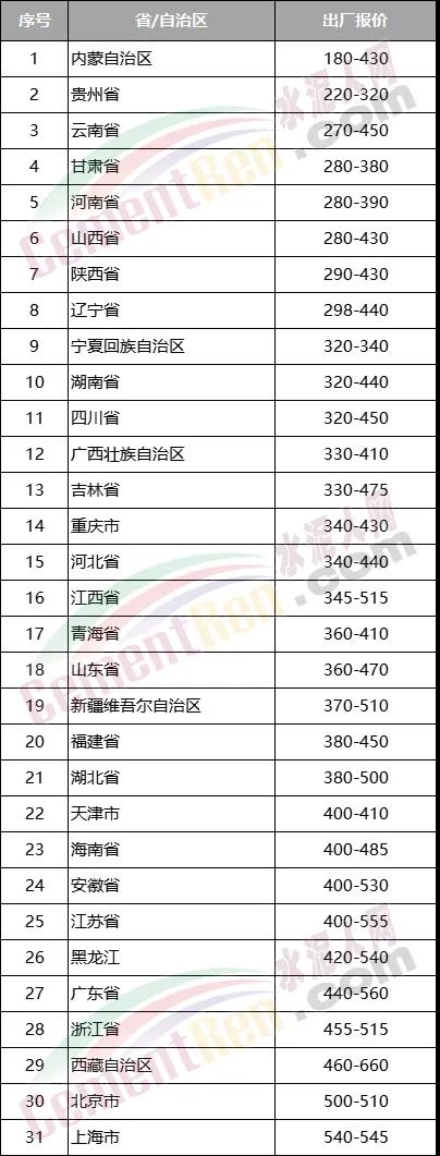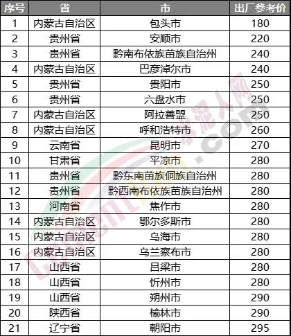 截止目前,水泥報價仍處于300元/噸以下的企業分布在甘肅省平涼市、貴州省安順市、貴陽市、六盤水市、黔東南苗族侗族自治州、黔南布依族苗族自治州、黔西南布依族苗族自治州;內蒙古自治區阿拉善盟、巴彥淖爾市、包頭市、鄂爾多斯市、呼和浩特市、烏海市、烏蘭察布市;山西省呂梁市、朔州市、忻州市以及陜西省榆林市、云南省昆明市、河南省焦作市;遼寧省朝陽市等20多個地區。