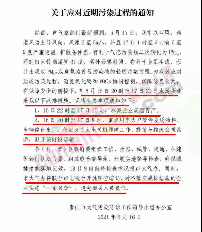 5月16日,唐山市發(fā)布《關(guān)于應(yīng)對(duì)近期污染過(guò)程的通知》稱,自5月16 日 20時(shí)至 I7日 20時(shí)水泥企業(yè)采取減排措施。16日22 時(shí)至 17日10時(shí),水泥企業(yè)旋窯停產(chǎn)。16 日20 時(shí)至17日8時(shí),重點(diǎn)用車(chē)大戶暫停發(fā)送物料,車(chē)輛停止出廠,企業(yè)負(fù)責(zé)大車(chē)司機(jī)保障工作,提前與物流公司溝通,避開(kāi)該時(shí)段運(yùn)輸。