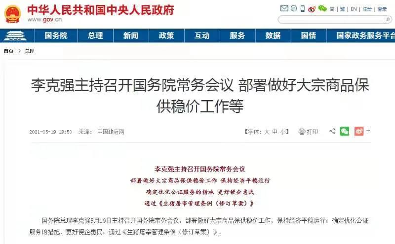 5月12日召開的國務院常務會議要求,跟蹤分析國內外形勢和市場變化,有效應對大宗商品價格過快上漲及其連帶影響。