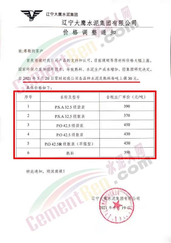 日前,遼寧大鷹通知自5月20日起上調各標號水泥及熟料價格30元/噸。上調后PO42.5散裝水泥報價430元/噸,熟料報價390元/噸。