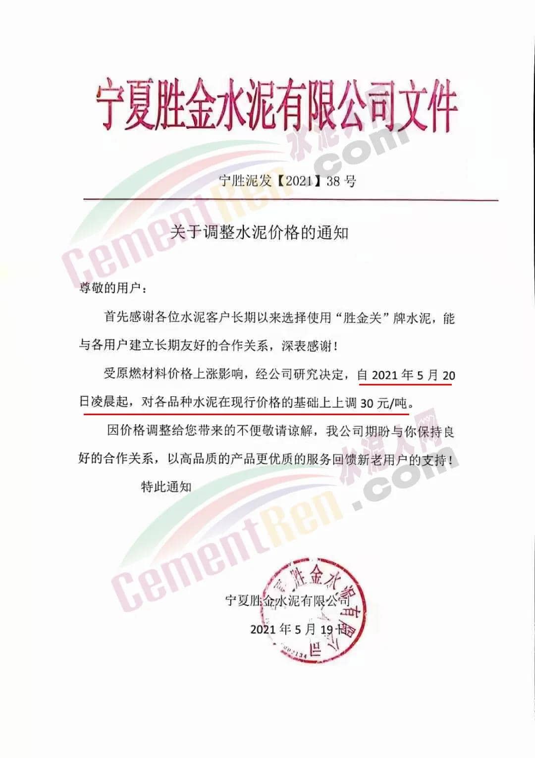 寧夏勝金水泥通知,5月20日起對各品種水泥上調30元/噸。