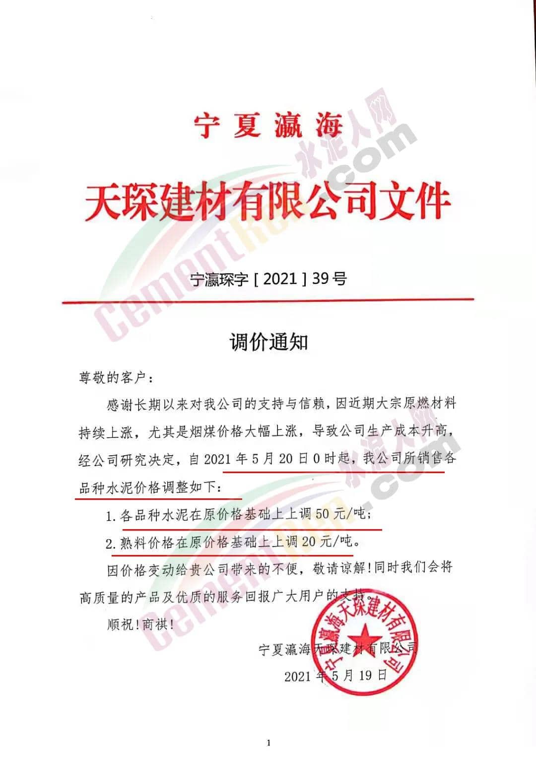 寧夏瀛海天琛建材有限公司通知自5月20日起,上調各品種水泥價格50元/噸,熟料價格上調20元/噸。