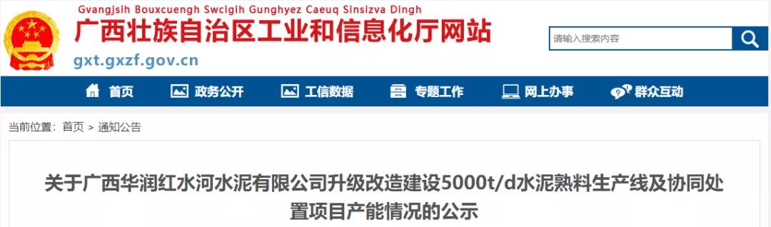 日前,廣西壯族自治區工業和信息化廳發布《關于廣西華潤紅水河水泥有限公司升級改造建設5000t/d水泥熟料生產線及協同處置項目產能情況的公示》稱,按照相關通知要求,將廣西華潤紅水河水泥有限公司升級改造建設5000t/d水泥熟料生產線及協同處置項目產能情況進行公示,具體公式如下: