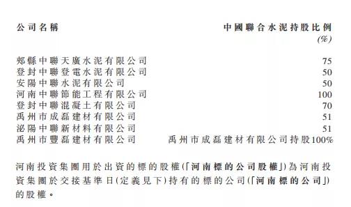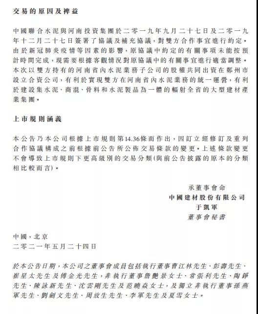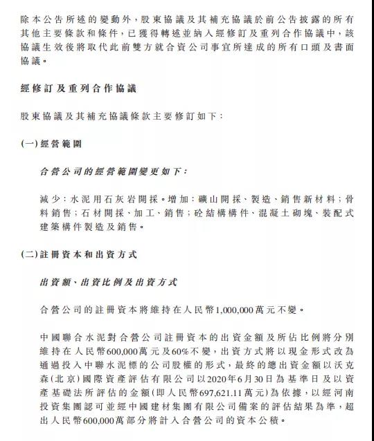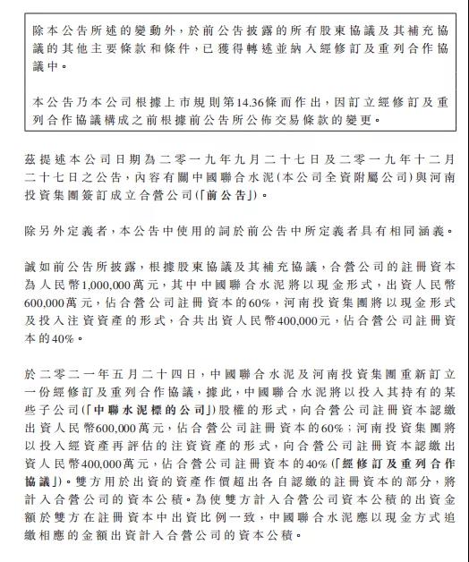 中國聯合水泥與河南投資集團于2019年9月27日及2019年12月27日簽署了協議及補充協議,對雙方合作事宜進行約定。由于新冠肺炎疫情等因素的影響,原協議中約定的有關事項未能按預計時間完成,現需要根據客觀情況對原協議中的有關事宜進行適當調整。本次以雙方持有的河南省內水泥業務子公司的股權共同出資在鄭州市設立合資公司,有利于實現雙方在河南省內水泥業務的統一運營,有利于建設集水泥、商混、骨料和水泥制品為一體的輻射全省的大型建材產業集團。