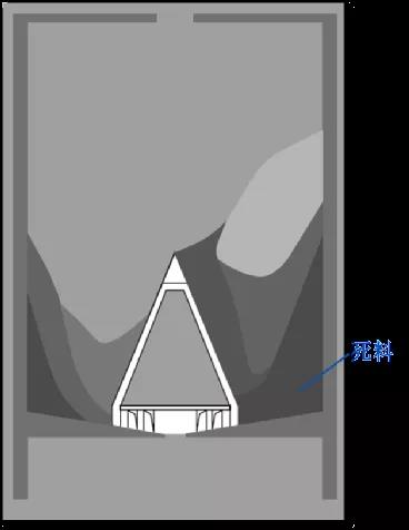 安裝了太極錐后,受料位高度,含氣量及使用情況的影響,料位下降到一定高度后,由于對應 F重變小,導致 (F重+F吸)<F拱,就會形成邊壁部分料流流動變慢,而中部軟料繼續維持整體流,結構變成部分整體流,兩者高差逐步擴大,逐步形成尾料。