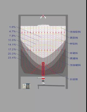 太極錐的結構與硬軟料的自然分層形成逐級對應,保證底部硬料最優先進入,最外層硬料對應最底層入口,中心最軟料被自然對應在最高層入口,運行時只要卸料,太極錐內的料重產生下拉真空吸附力F吸(約有1-2噸重),與錐外的料位垂直重力疊加擠推力F重,里應外合共同作用,破除其收縮拱而產生持續進料流動: