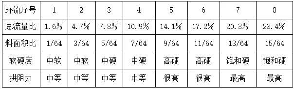 太極錐產生的整體流特征非常明顯:最外環部分硬度最高,垂直料重占比最大達23.4%,也是最先進入太極錐的最大流量23.4%,前4級的底部最硬料部分合計高達75%流量,后4級的中硬料合計僅占25%流量,最中心部分的軟料只占1.6%,完全區別于氣動卸放的中心漏斗軟料優先方式,形成了典型的外快內慢等差流量分布,而外圍硬料大料流自然形成了對庫壁及底部的自動清理,根本沒有死料偏庫發生的機會。