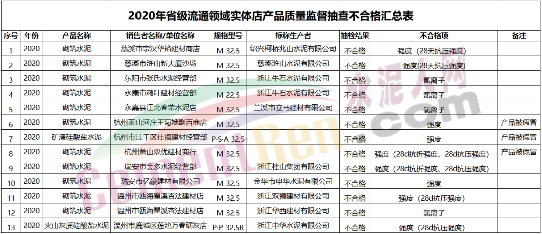 日前,浙江省市場監(jiān)管局發(fā)布《關(guān)于2020年流通領(lǐng)域?qū)嶓w店產(chǎn)品質(zhì)量監(jiān)督抽查情況的通報》稱,浙江省市場監(jiān)管局對2020年以來流通領(lǐng)域?qū)嶓w店銷售的水泥等14種重點消費品開展了產(chǎn)品質(zhì)量監(jiān)督抽查,其中抽查的40批次水泥產(chǎn)品中有13批次產(chǎn)品不合格,不合格發(fā)現(xiàn)率為32.50%。具體抽查情況通報如下: