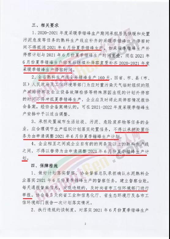 1、2020-2021年度采暖季錯峰生產期間承擔居民供暖和處置污泥危廢等任務的熟料生產線應補齊的采暖季錯峰生產停窯時間。不得抵消2021年6月份夏季錯峰生產。如采暖季錯峰生產補停窯計劃與2021年6月份夏季錯峰生產時間重疊,須在2021年6月份夏季錯峰生產結束后繼續補停窯直至補齊2020-2021年度采暖季錯峰生產停窯時間。