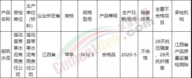 江西省市場監督管理局發布監督抽查結果顯示一個批次砌筑水泥28天抗壓強度、28天抗折強度不合格。產品生產單位標稱為蓮花縣琴亭水泥有限責任公司。