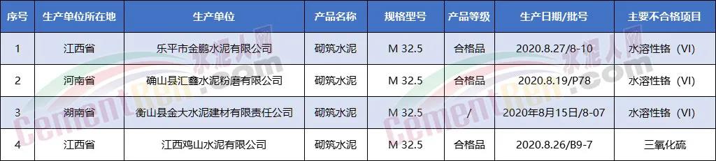 多區域通報水泥抽查不合格,涉及強度、水溶性鉻(VI)、燒失量、氯離子等