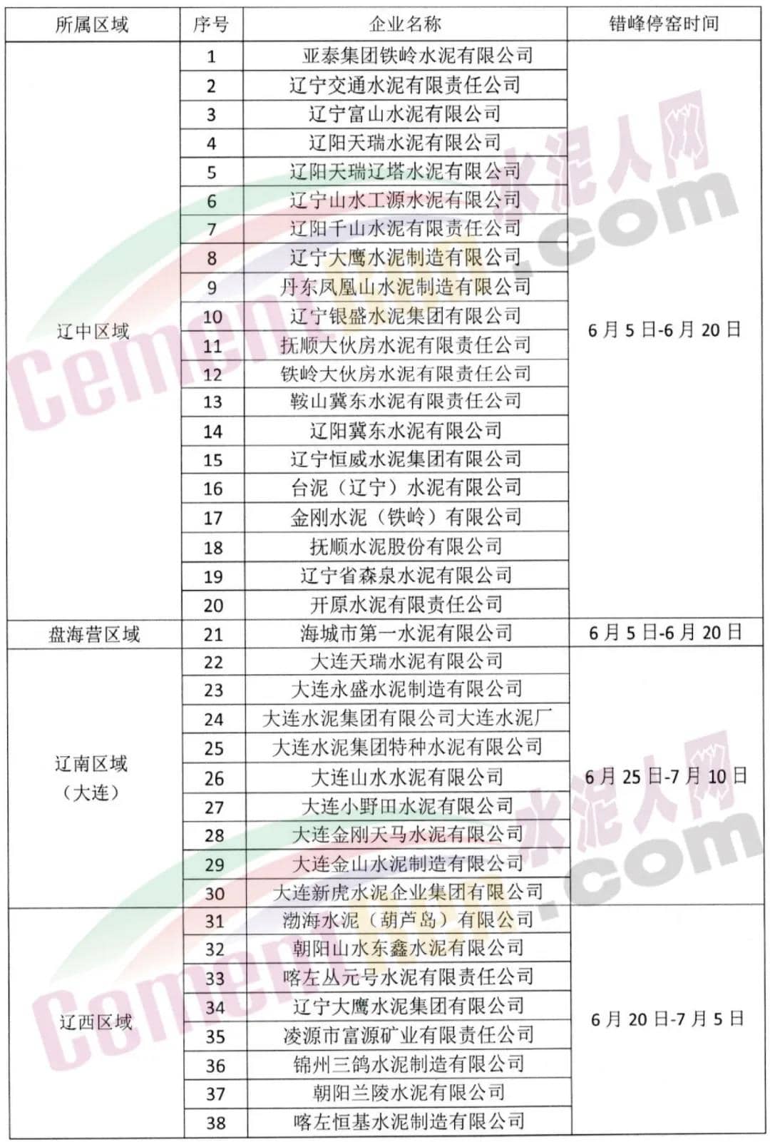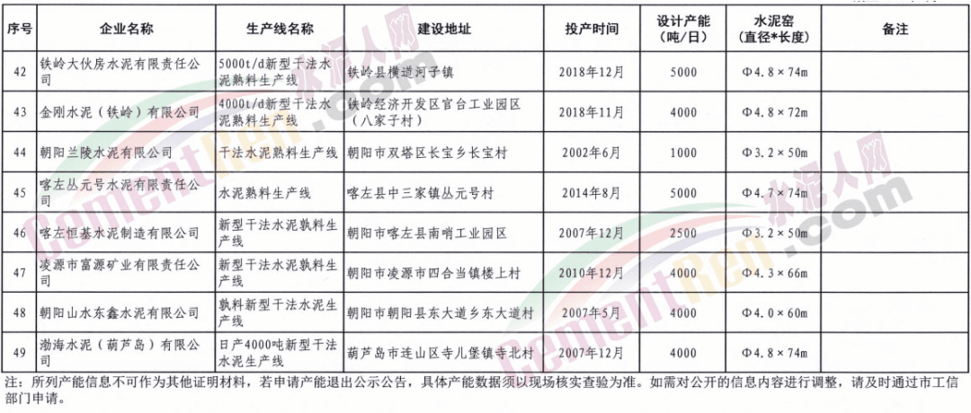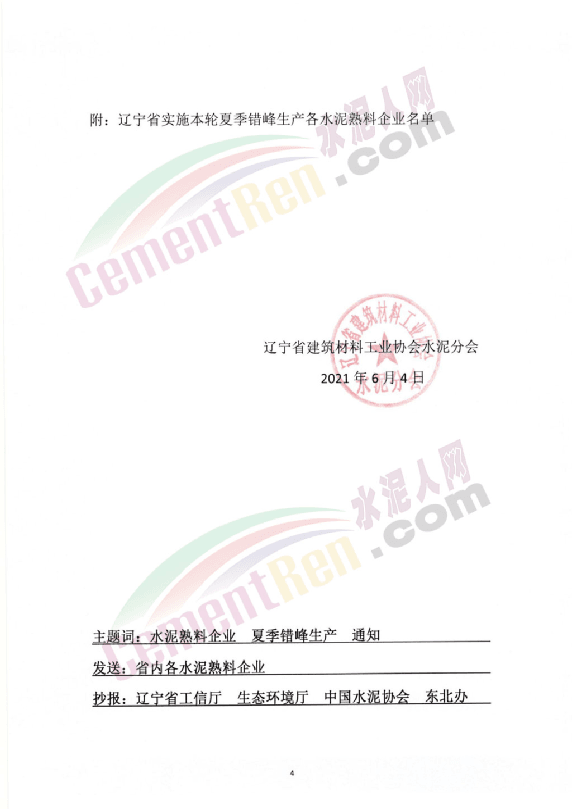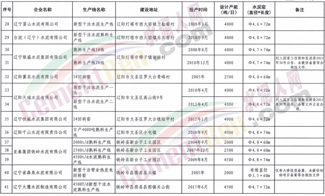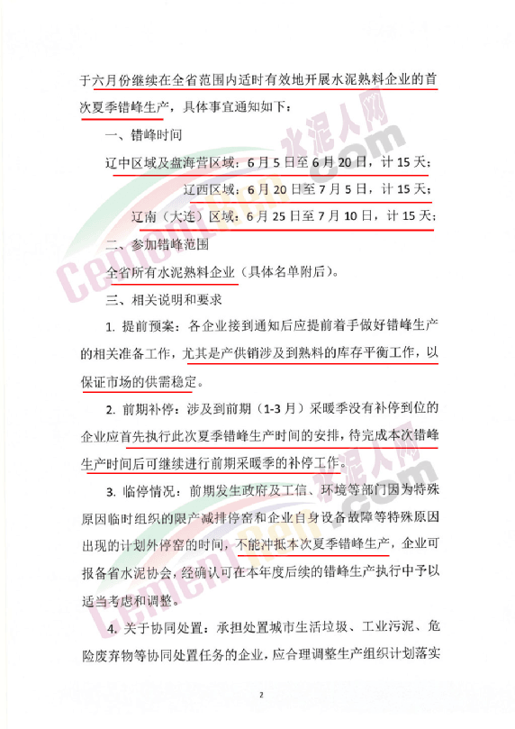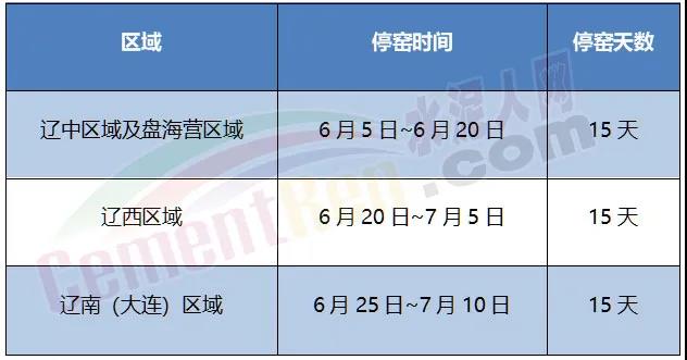 遼寧省熟料生產線首次夏季錯峰時間表