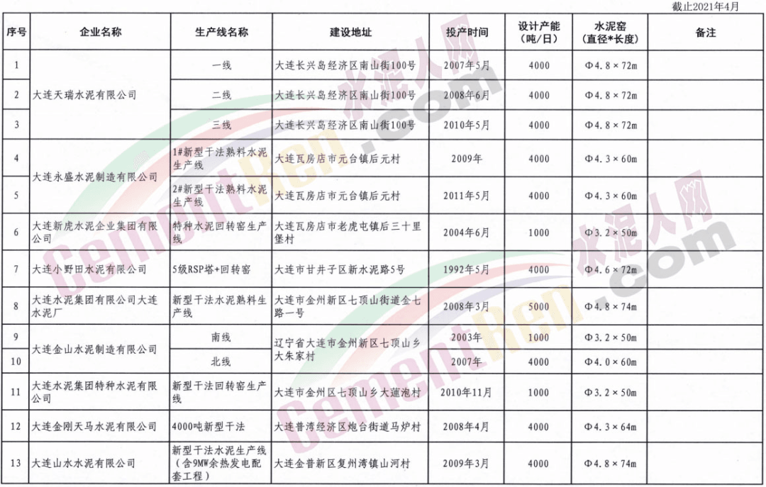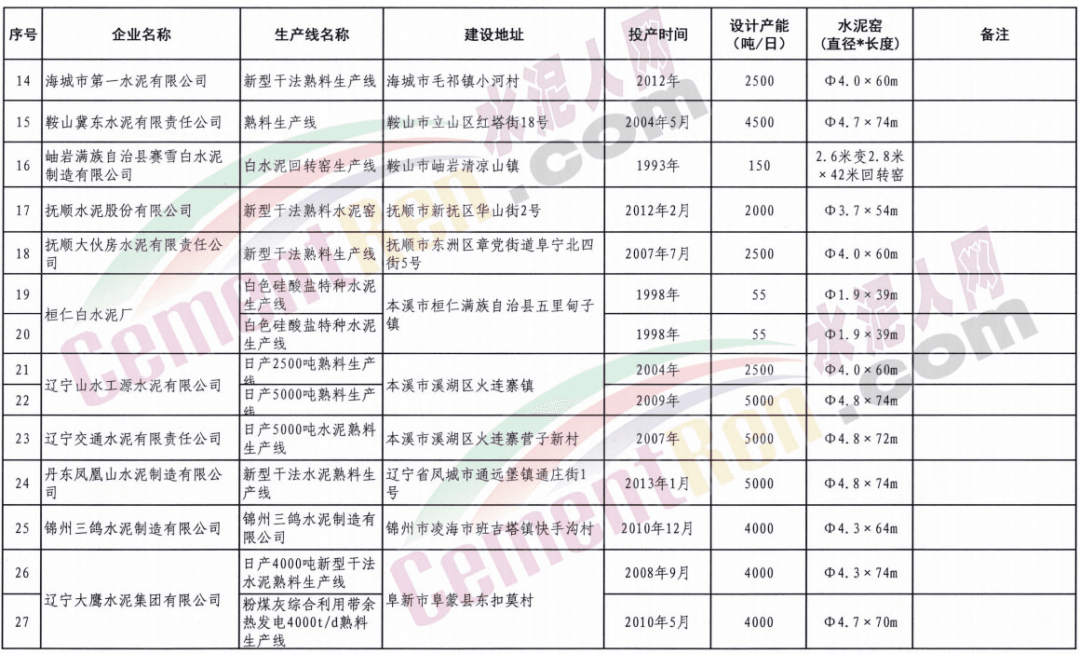 遼寧省所有熟料生產線清單