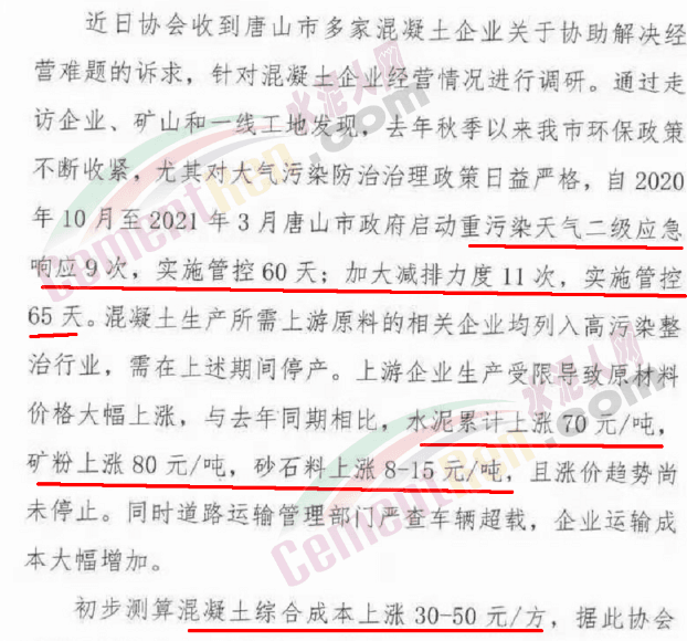 上月唐山市商品混凝土行業協會曾發布《倡議書》稱,自2020年10月至2021年3月唐山市政府啟動重污染天氣二級應急響應9次,實施管控60 天;加大減排力度11次,實施管控65天。