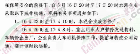 5月16日20時至17日20時水泥企業采取減排措施。16日22時至17日10時,水泥企業旋窯停產。16日20時至17日8時,重點用車大戶暫停發送物料,車輛停止出廠。