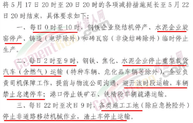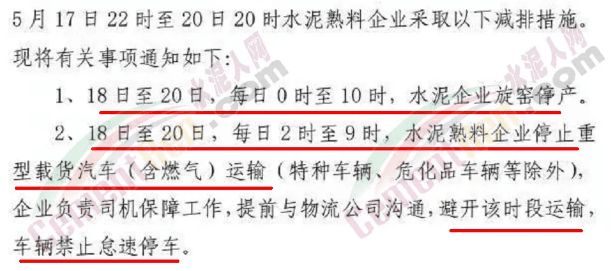 與本次管控要求類似的管控文件,上個月唐山地區曾連發五文。5月21日20時-22日10時,水泥企業旋窯停止生產;5月21日22時-22日10時,水泥企業停止重型載貨汽車運輸,提前與物流公司溝通,避開該時段運輸,車輛禁止怠速停車。