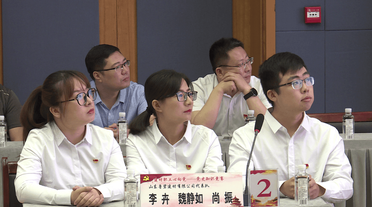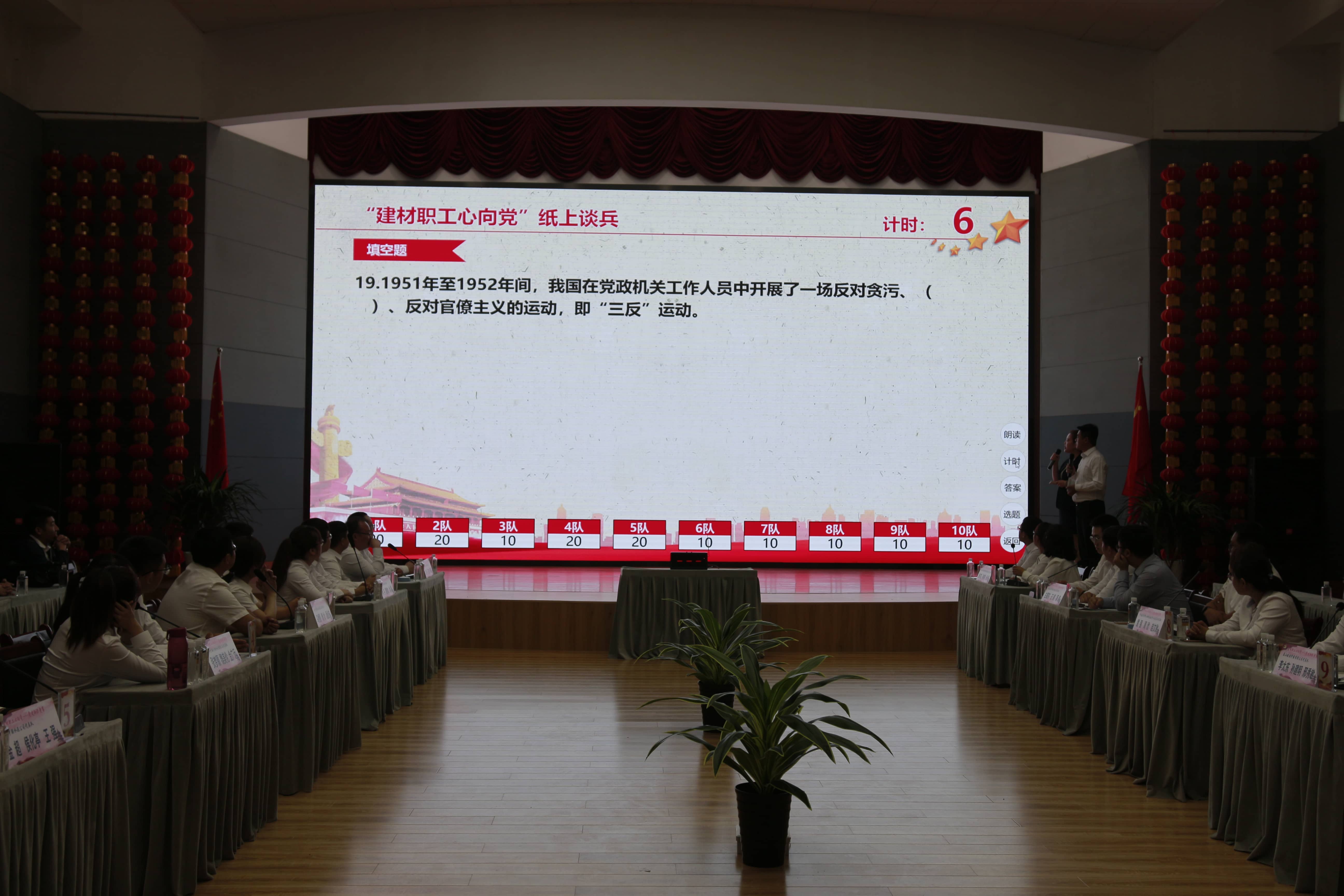 在活動現場,10支代表隊充分展現了建材企業職工的政治理論功底和斗志昂揚的精神狀態,這是一場別開生面的智慧較量和腦力比拼。經過紙上談兵、飛奪瀘定橋、回顧黨的歷史、三方會談、黃金60秒、開弓亮劍六個環節的激烈比拼角逐,最終確定了比賽的一二三等獎。