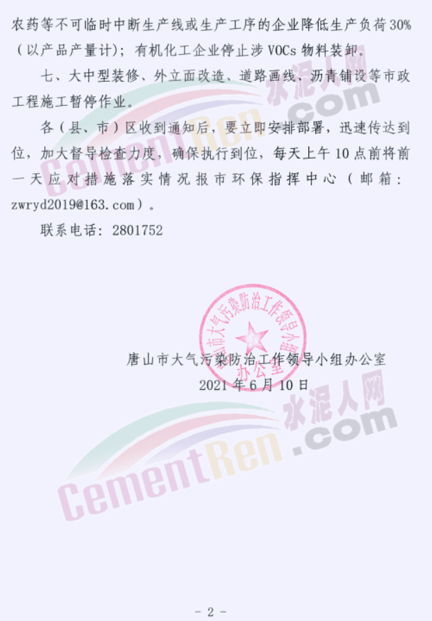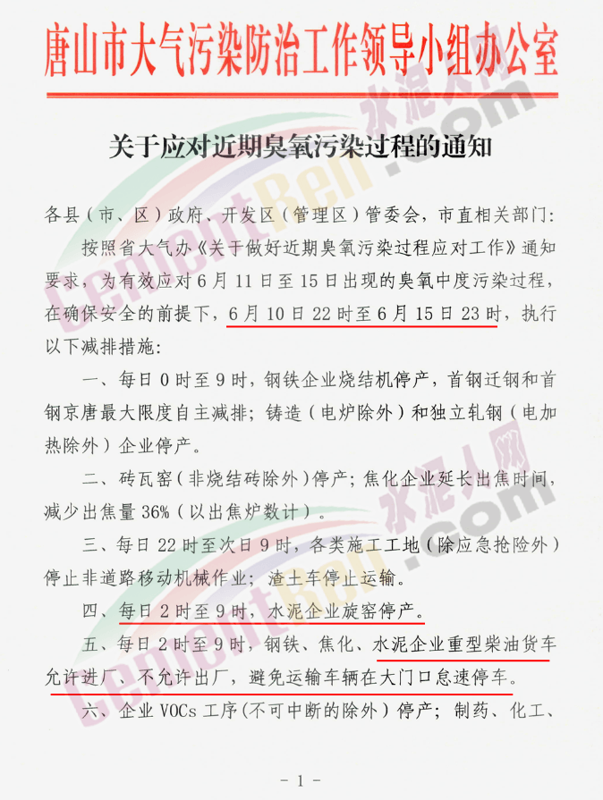 日前,唐山市大氣污染防治工作領(lǐng)導(dǎo)小組辦公室發(fā)布《關(guān)于應(yīng)對近期臭氧污染過程的通知》給轄區(qū)各縣(市、區(qū))政府、開發(fā)區(qū)(管理區(qū))管委會,市直相關(guān)部門稱,按照省大氣辦《關(guān)于做好近期臭氧污染過程應(yīng)對工作》通知要求,為有效應(yīng)對6月 11日至 15 日出現(xiàn)的臭氧中度污染過程,在確保安全的前提下,6月10日 22時至6月15日 23時,每日 2 時至 9 時,水泥企業(yè)旋窯停產(chǎn);每日 2 時至 9 時,鋼鐵、焦化、水泥企業(yè)重型柴油貨車允許進廠、不允許出廠,避免運輸車輛在大門口怠速停車。