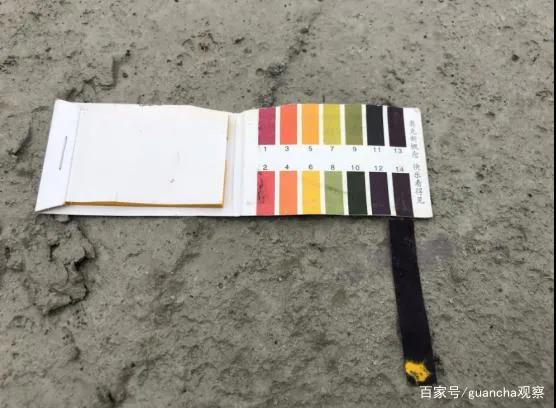 6月2日,在天津市靜海區調查時發現,位于同合公司廠區緊鄰的路邊,在路邊上有一片,充斥著大量的水泥結塊、灰渣,大量被傾倒后已經凝固的混凝土漿還保留著之前的流動形態?;炷翝{中的水分滲出后,都聚在路邊的低洼處。在剛傾倒過不久的一堆混凝土漿中,經PH試紙檢測顯示其濃度堿液PH值在13—14左右。
