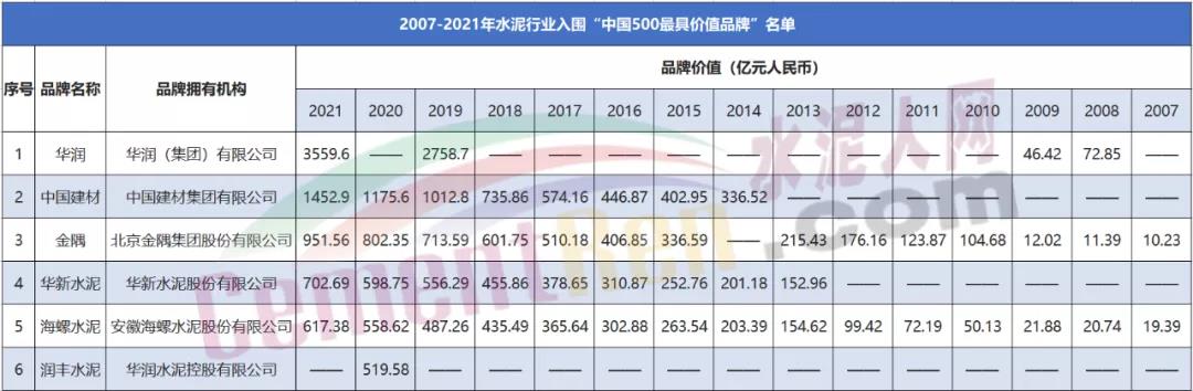 回顧歷年發布的《中國500最具價值品牌》名單,可以看出,中建材連續8年占據水泥行業品牌價值高位,海螺水泥則是水泥行業唯一一家自品牌活動開展15年以來,每年都上榜名單的水泥企業。