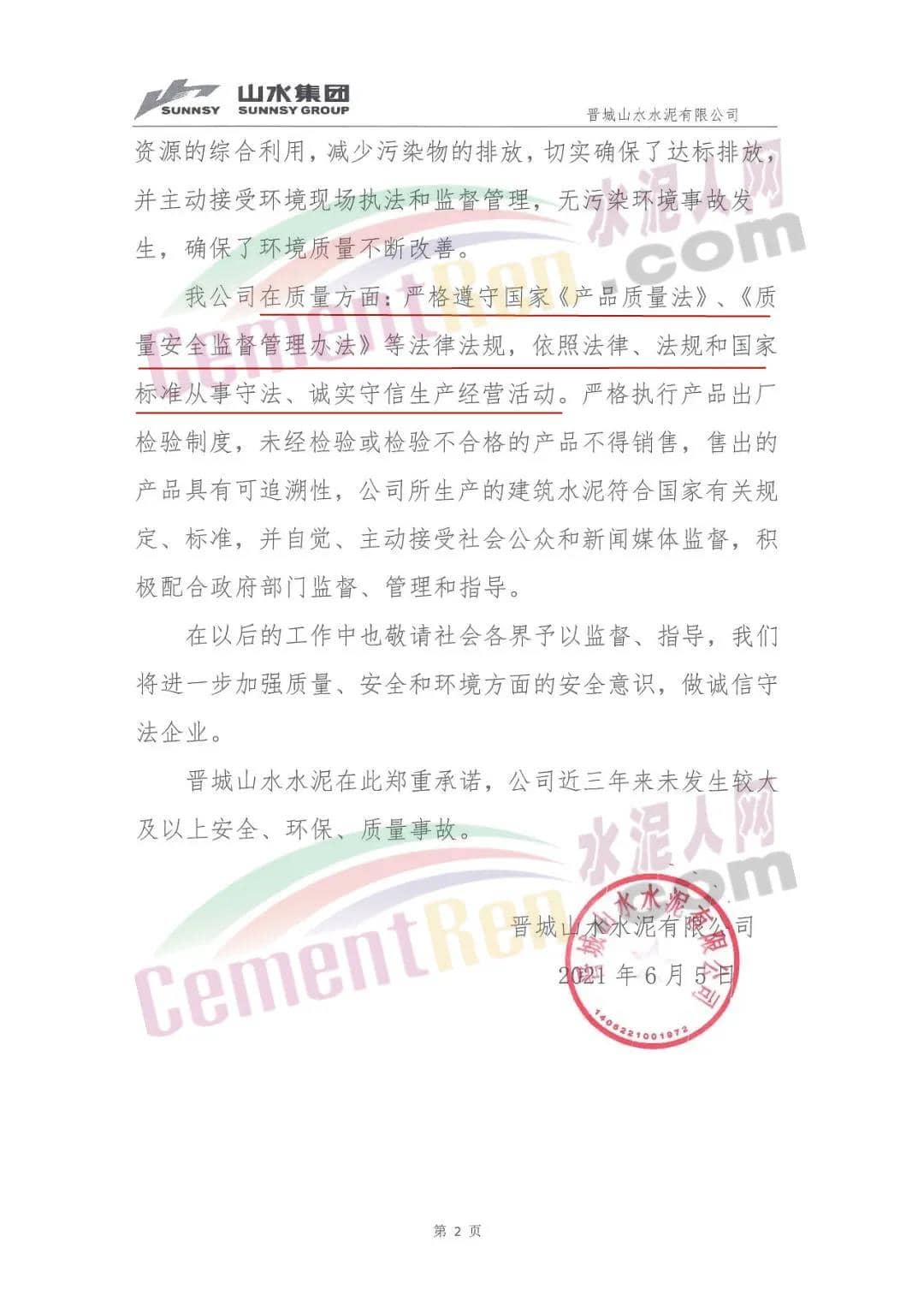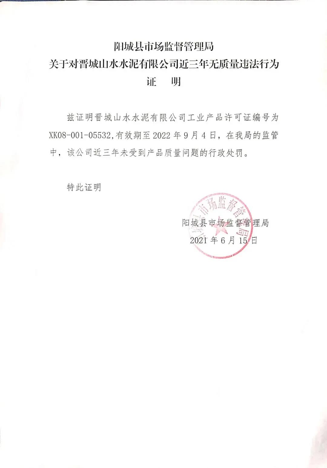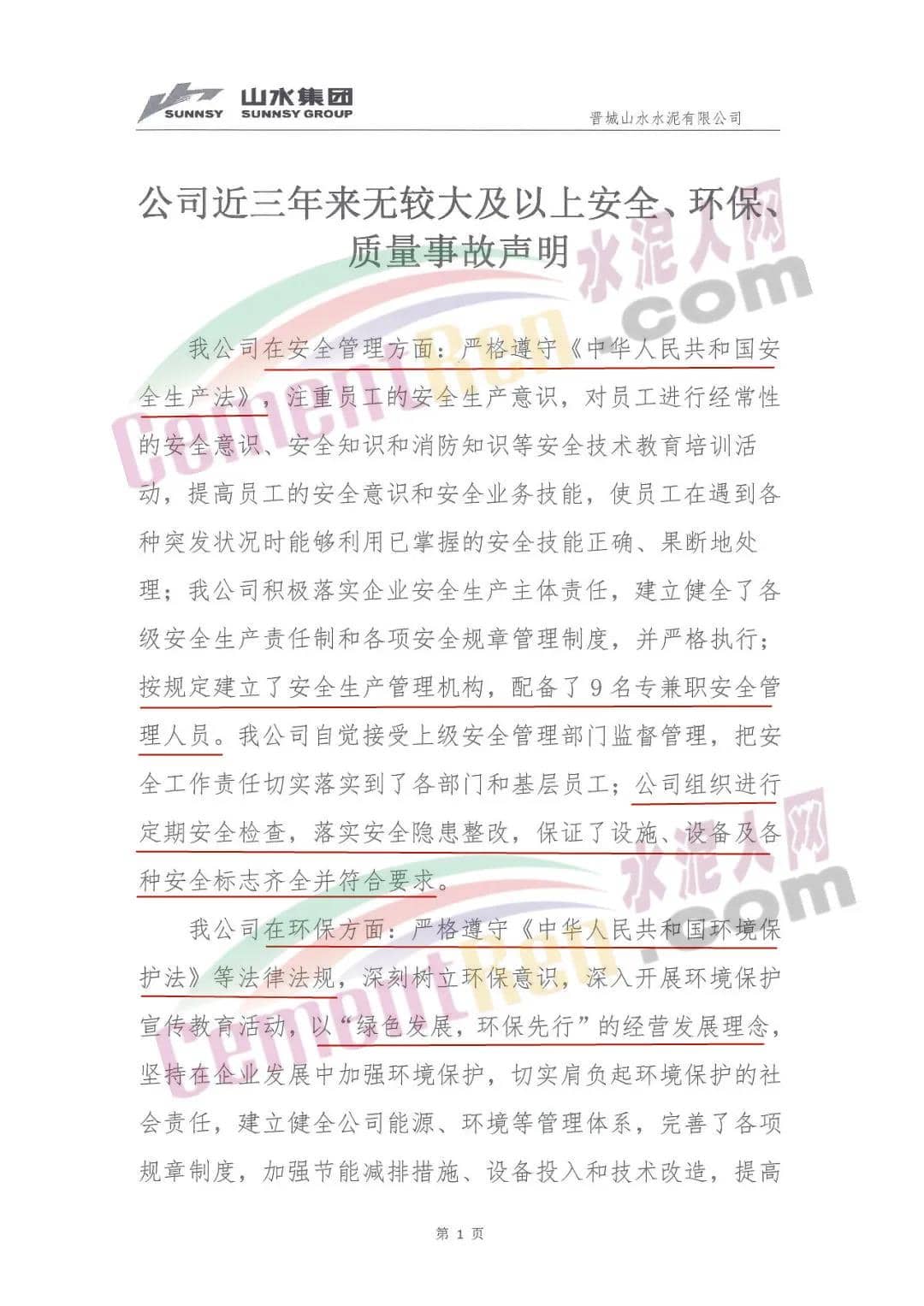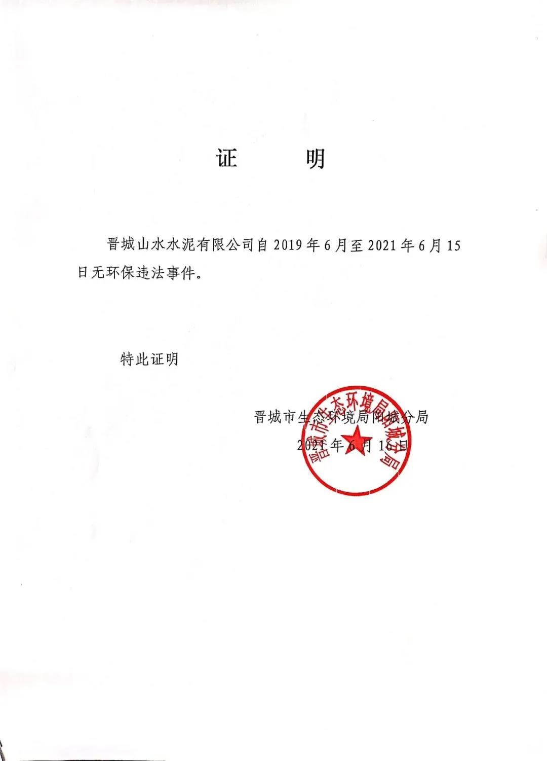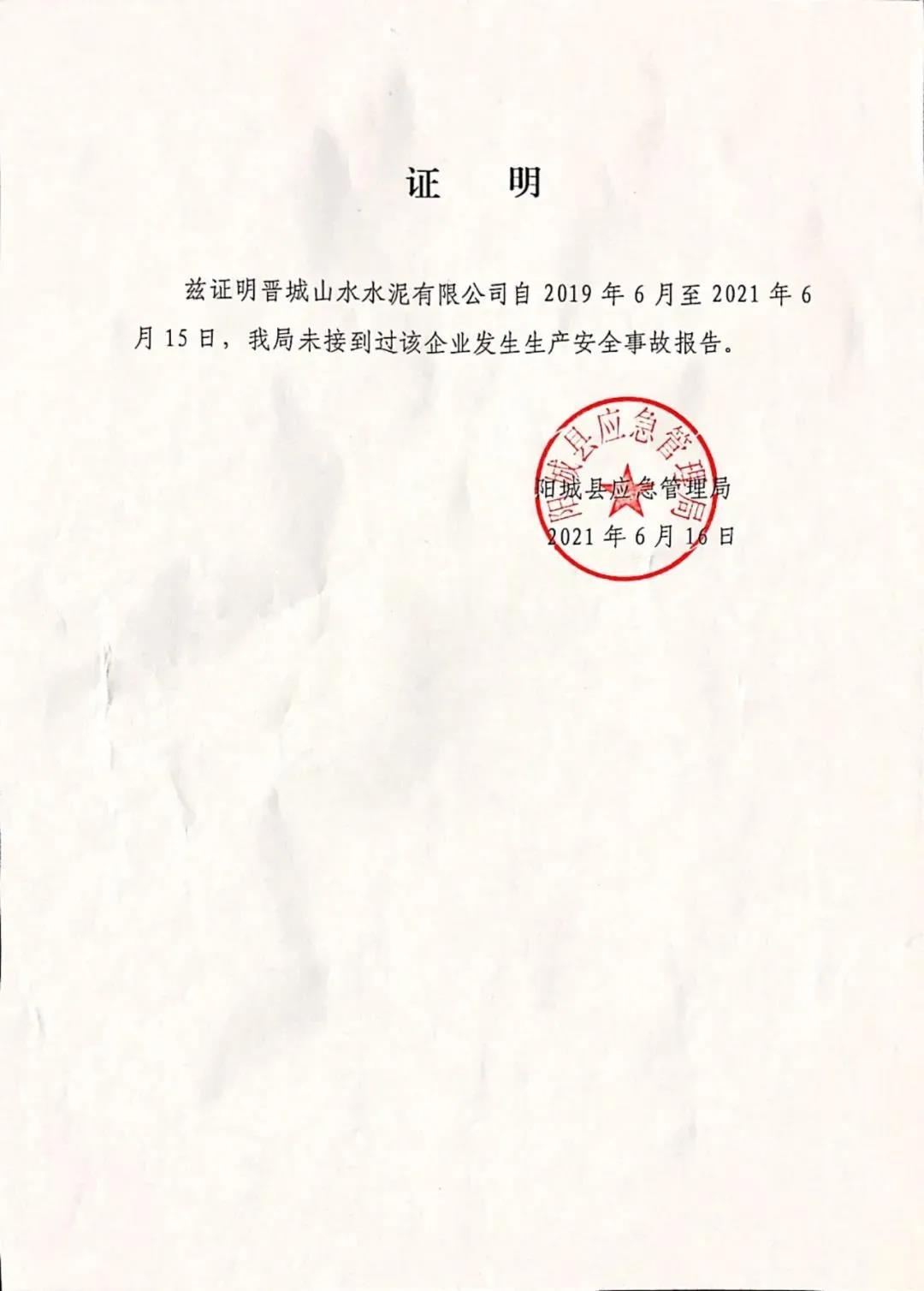 日前,晉城山水水泥有限公司發布《近三年來無較大及以上安全、環保、質量事故聲明》稱,