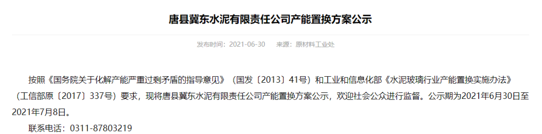 冀東水泥有限責任公司產(chǎn)能置換方案公示》將退出冀東水泥豐潤有限責任公司一條2000t/d生產(chǎn)線、唐山冀東水泥三友有限公司一條2500t/d生產(chǎn)線、河北金隅鼎鑫水泥有限公司一條4000t/d生產(chǎn)線,合計約255萬噸產(chǎn)能,用于唐縣冀東水泥有限責任公司新建一條5500t/d水泥