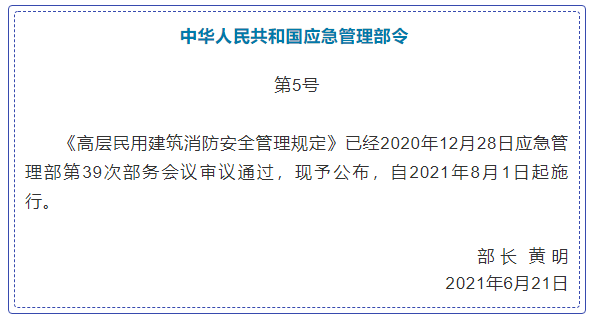 日前,應(yīng)急管理部發(fā)布《高層民用建筑消防安全管理規(guī)定》稱(chēng)《高層民用建筑消防安全管理規(guī)定》已經(jīng)2020年12月28日應(yīng)急管理部第39次部務(wù)會(huì)議審議通過(guò),現(xiàn)予公布,自2021年8月1日起施行。