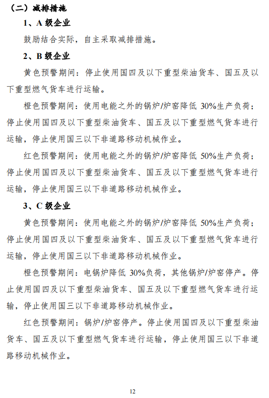 各地要對已開展績效分級的行業(yè),應(yīng)急減排措施應(yīng)嚴(yán)格滿足國家《重污染天氣重點(diǎn)行業(yè)應(yīng)急減排措施制定技術(shù)指南(2020年修訂版)》和省級績效分級有關(guān)文件等要求;對于未開展績效分級的行業(yè),應(yīng)結(jié)合本地應(yīng)急減排量需求明確應(yīng)急減排措施;對于電廠、供暖鍋爐房、小微涉氣企業(yè)等,納入清單,但不強(qiáng)制采取停限產(chǎn)措施,酌情采取交通運(yùn)輸管控措施。揚(yáng)塵源應(yīng)按照揚(yáng)塵污染防治規(guī)范標(biāo)準(zhǔn)明確應(yīng)急減排措施。涉大宗物料運(yùn)輸單位應(yīng)制定應(yīng)急運(yùn)輸管控方案并安裝門禁系統(tǒng)。清單內(nèi)工業(yè)企業(yè)及施工工地等均應(yīng)制定重污染應(yīng)急減排措施“公示牌”,并置于入廠顯眼位置。在重污染天氣預(yù)警期間,要嚴(yán)格落實(shí)應(yīng)急減排清單明確的各項(xiàng)應(yīng)急減排措施,確保可操作、可監(jiān)測、可核查,切實(shí)發(fā)揮減排效應(yīng),保證績效分級工作的權(quán)威性和嚴(yán)肅性。