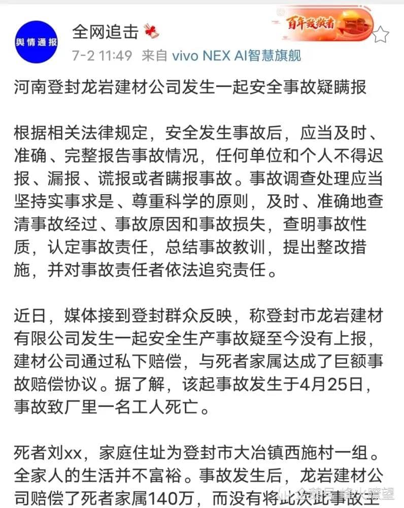 死者劉xx,家庭住址為登封市大冶鎮西施村一組。全家人的生活并不富裕。事故發生后,龍巖建材公司賠償了死者家屬140萬,而沒有將此次此事故主動上報政府部門,存在瞞報安全生產事故嫌疑。
