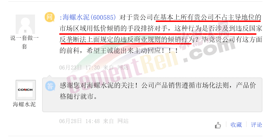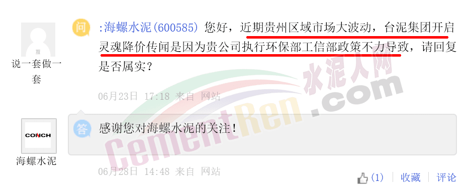 有投資者在上證e互動(dòng)平臺(tái)向海螺水泥提問稱,近期貴州區(qū)域市場(chǎng)出現(xiàn)較大波動(dòng),臺(tái)泥集團(tuán)開啟靈魂降價(jià),傳聞是因?yàn)楹B菟鄨?zhí)行環(huán)保部工信部政策不力導(dǎo)致,請(qǐng)回復(fù)是否屬實(shí)?海螺水泥上市公司回復(fù)“感謝您對(duì)海螺水泥的關(guān)注”。