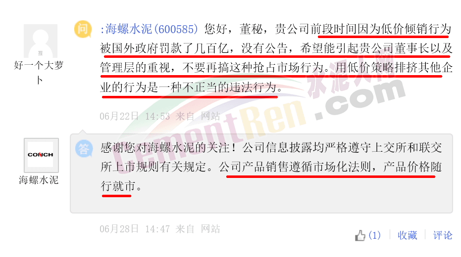 同期,有投資者提問,海螺水泥前段時(shí)間因?yàn)榈蛢r(jià)傾銷行為被國外政府罰款了幾百億,沒有公告,希望能引起貴公司董事長(zhǎng)以及管理層的重視,不要再搞這種搶占市場(chǎng)行為。用低價(jià)策略排擠其他企業(yè)的行為是一種不正當(dāng)?shù)倪`法行為。海螺水泥上市公司回復(fù)稱,公司產(chǎn)品銷售遵循市場(chǎng)化法則,產(chǎn)品價(jià)格隨行就市。
