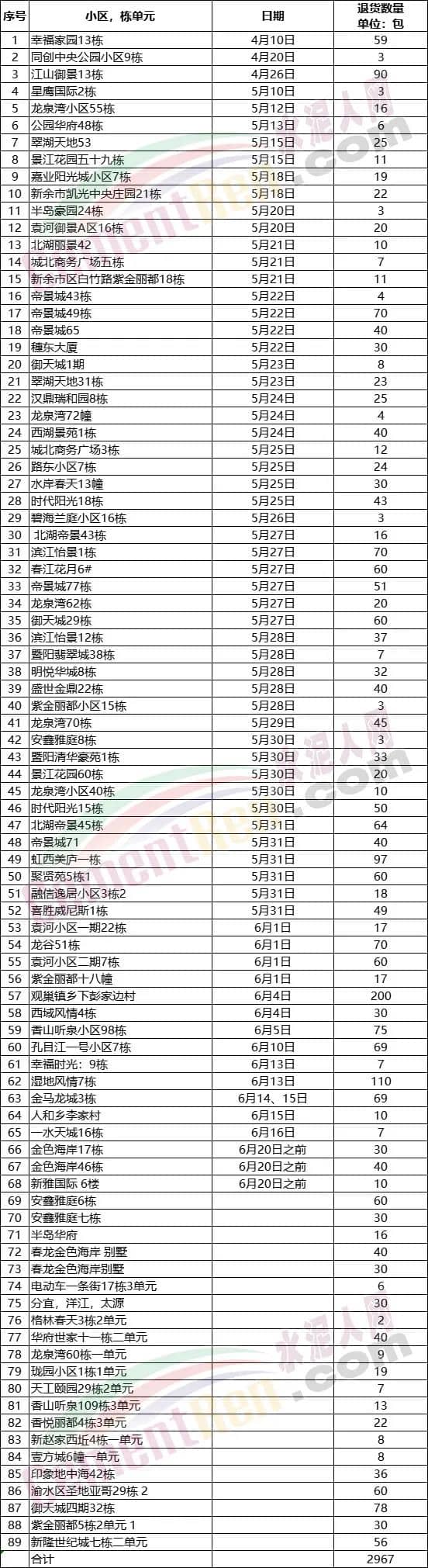 據水泥人網不完全統計,截止6月10日14時,有約2967包(約148噸)水泥反饋需要退貨。生產日期從4月10日至6月20日之前均有,最多的退貨200包,最少的也有2包剩余需要退貨。涉及紫金麗都、袁河小區、御天城、印象地中海、壹方城、觀巢鎮鄉下彭家邊村、濕地風情、虹西美廬、江山御景、香山聽泉等89戶業主詳細如下: