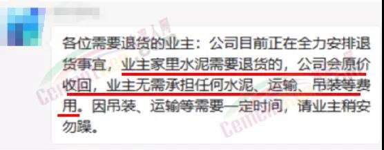6月29日上午,海螺水泥相關負責人在業主群里發布消息稱,有退貨需求的業主,且水泥出廠時間在6月20日前的,可在群里反饋信息。公司已經成立了3個退貨工作小組,會在兩天內安排完成退貨。