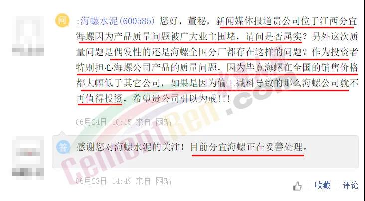 日前,有投資者在上證e互動平臺向海螺水泥提問稱,新聞媒體報道貴公司位于江西分宜海螺因為產品質量問題被廣大業主圍堵,是否屬實?這次質量問題是偶發性的還是海螺全國分廠都存在這樣的問題?作為投資者特別擔心海螺公司產品的質量問題,因為畢竟海螺在全國的銷售價格都大幅低于其它公司,如果是因為偷工減料導致的那么海螺公司就不再值得投資。海螺水泥上市公司回復稱,目前分宜海螺正在妥善處理。