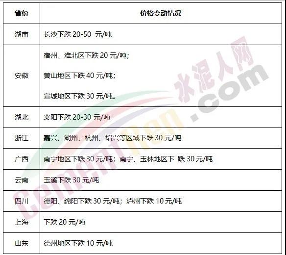 據(jù)水泥人網(wǎng)此前報道,上周內(nèi)浙江、安徽、上海、山東、廣西、湖南、湖北、云南、四川等多區(qū)域下調(diào)水泥價格10-50元/噸,其中湖南長沙個別企業(yè)一次性下調(diào)50元/噸。