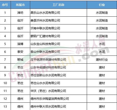 7月5日,山東省工業(yè)和信息化廳發(fā)布《省級(jí)綠色工廠(第一批)名單公示》。公示名單85家省級(jí)綠色工廠中,包括昌樂山水水泥有限公司、費(fèi)縣沂州水泥有限公司、沂南中聯(lián)水泥有限公司、蒙陰廣匯建材有限公司、山東寶山科技有限公司、泰山中聯(lián)水泥有限公司、茌平信源環(huán)保建材有限公司、山東中巖建材科技有限公司、棗莊創(chuàng)新山水水泥有限公司、棗莊山水水泥有限公司、華沃(棗莊)水泥有限公司、德州中聯(lián)大壩水泥有限公司等13家水泥建材企業(yè)。