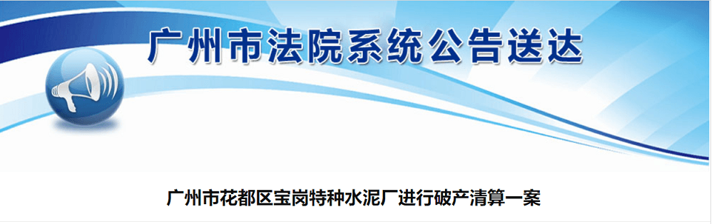 近日,廣州市法院就廣州市花都區(qū)寶崗特種水泥廠進(jìn)行破產(chǎn)清算一案發(fā)布公告: