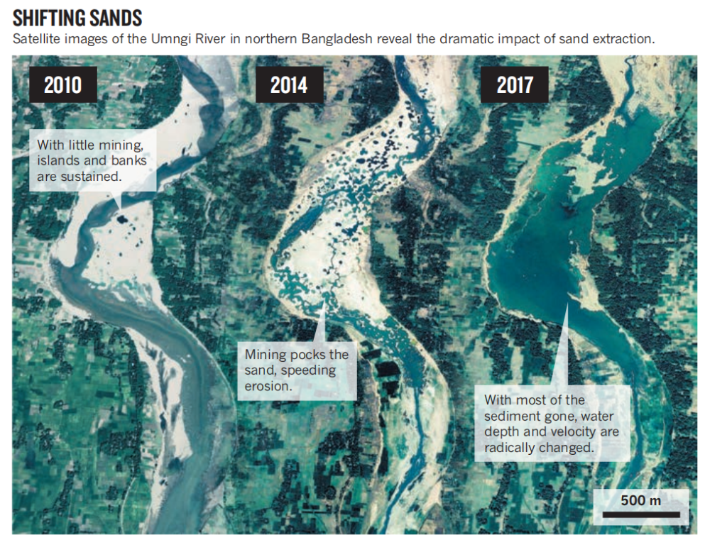 孟加拉國北部烏姆吉河的衛星圖像顯示了采砂的巨大影響